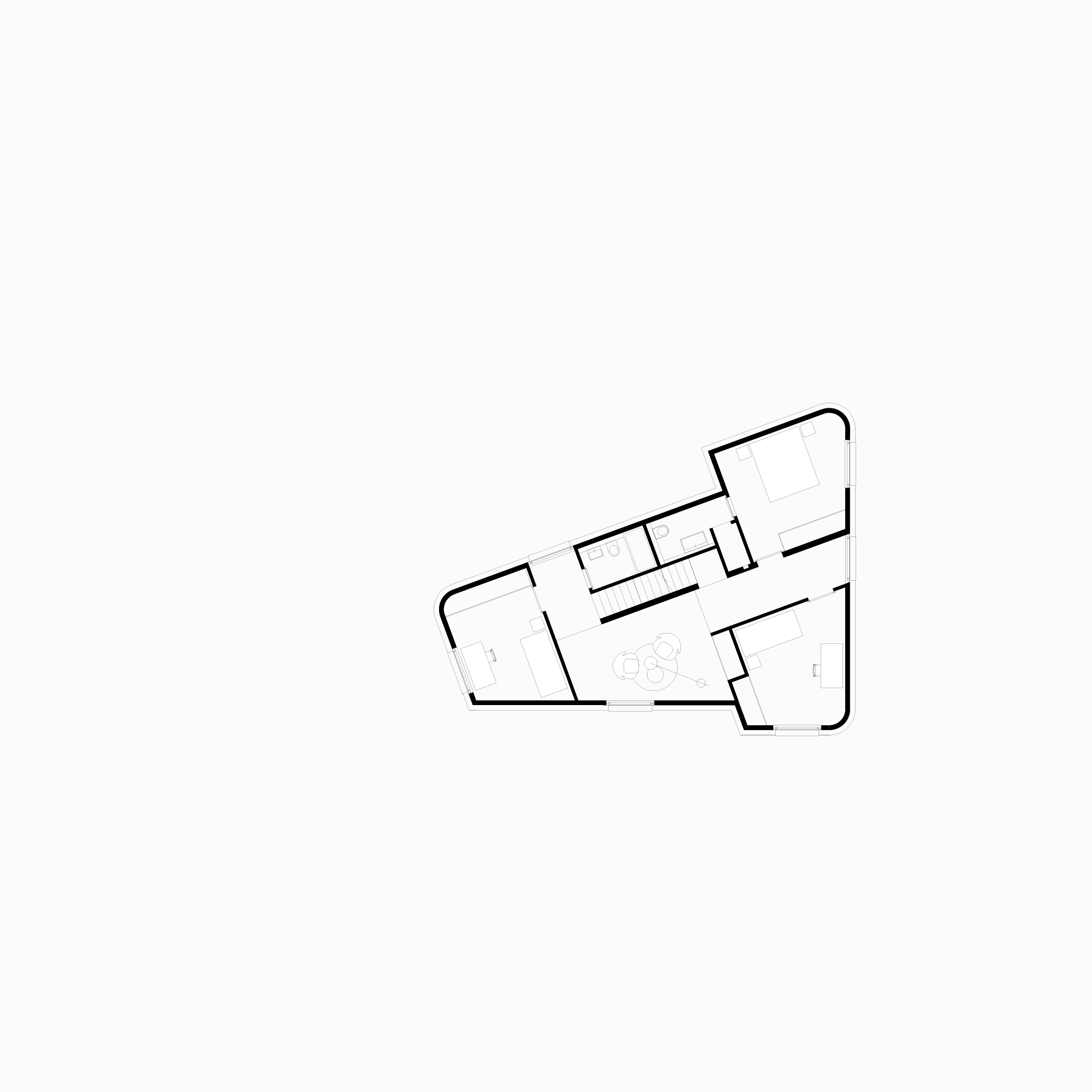 Die erste Herausforderung bestand darin, ein Projekt in einem sehr begrenzten Perimeter zu entwickeln. Die Geometrie des Plans ist das Ergebnis einer Optimierung der bebaubaren Fläche, wobei die Grenzen der Vorschriften eingehalten werden.