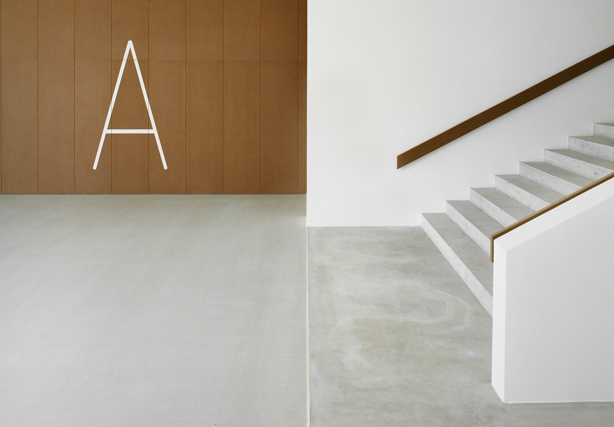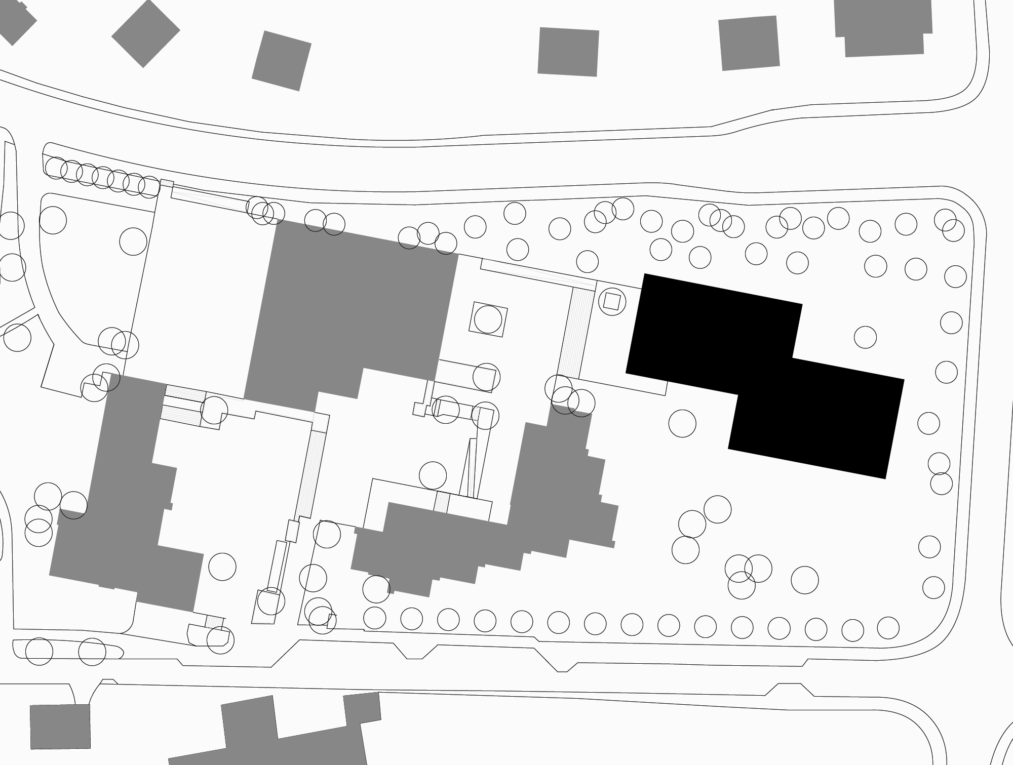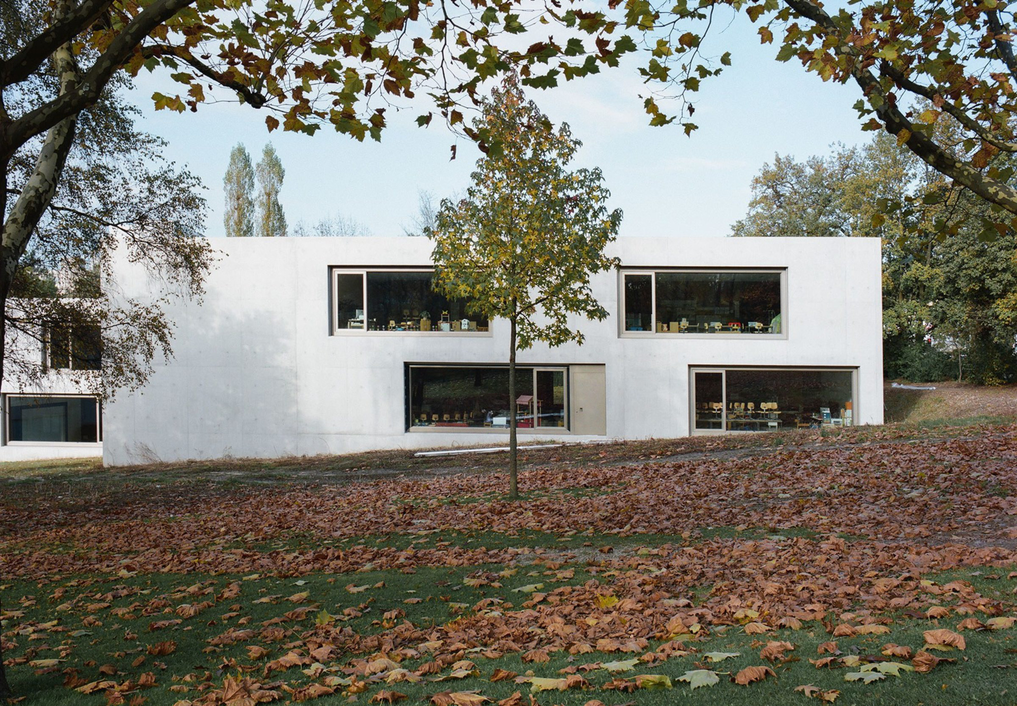 Les deux volumes entremêlés qui composent le bâtiment sont posés sur la pente régulière du terrain. Leur hauteur modeste et leur position décalée verticalement et horizontalement confère à l’objet un caractère sobre, calme et une échelle raisonnable. On retrouve cette sobriété dans la composition des façades où s’alternent des pleins gris clairs et de grandes ouvertures. Le nombre limité des fenêtres, leur proportion large et leur disposition concourent à l’expression calme et rassurante de l’école enfantine.
