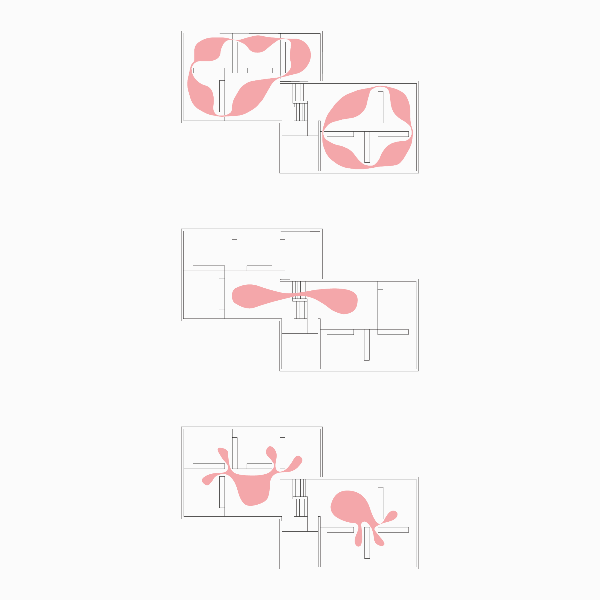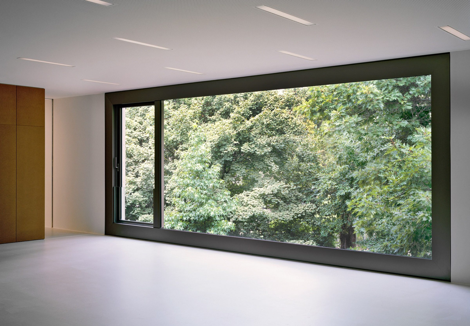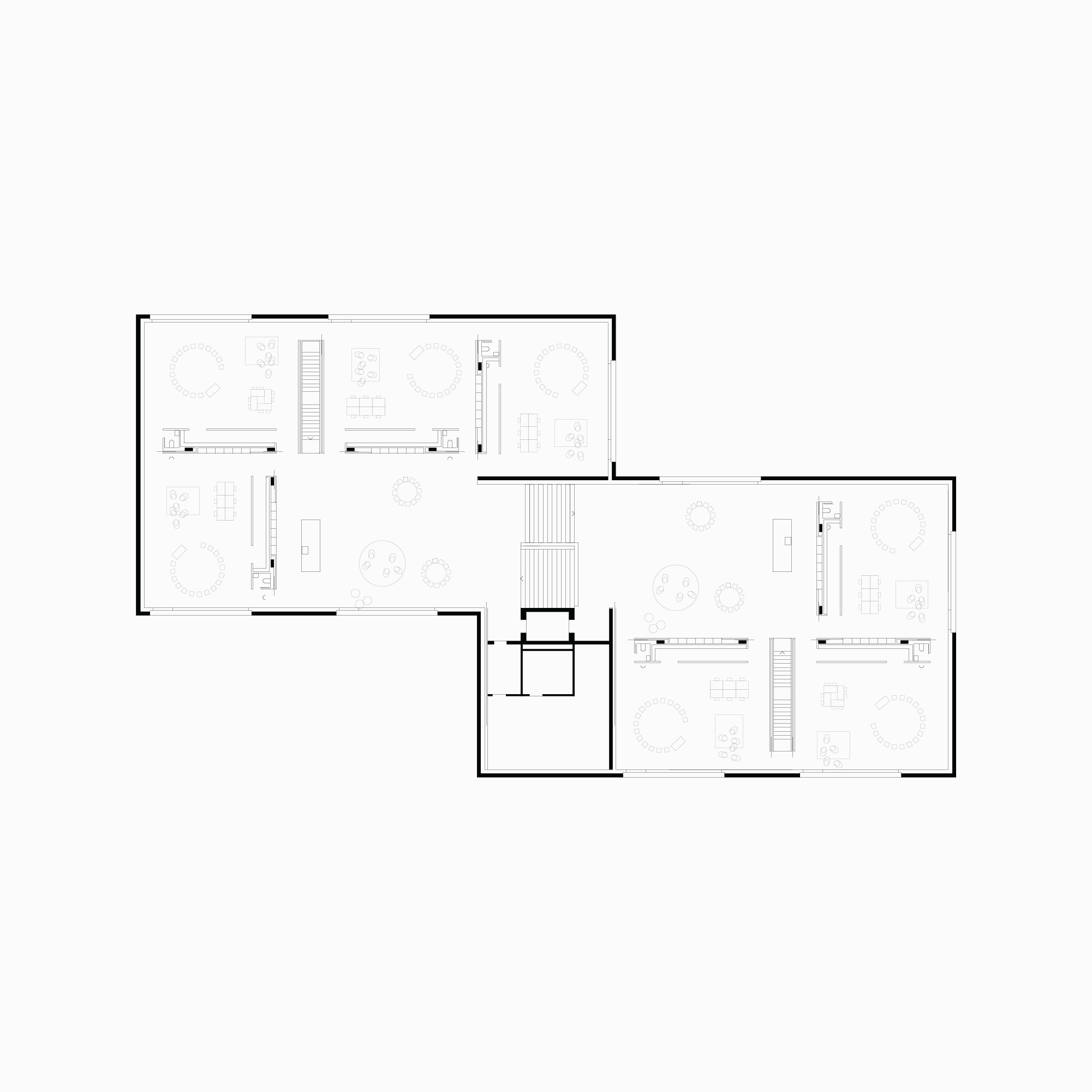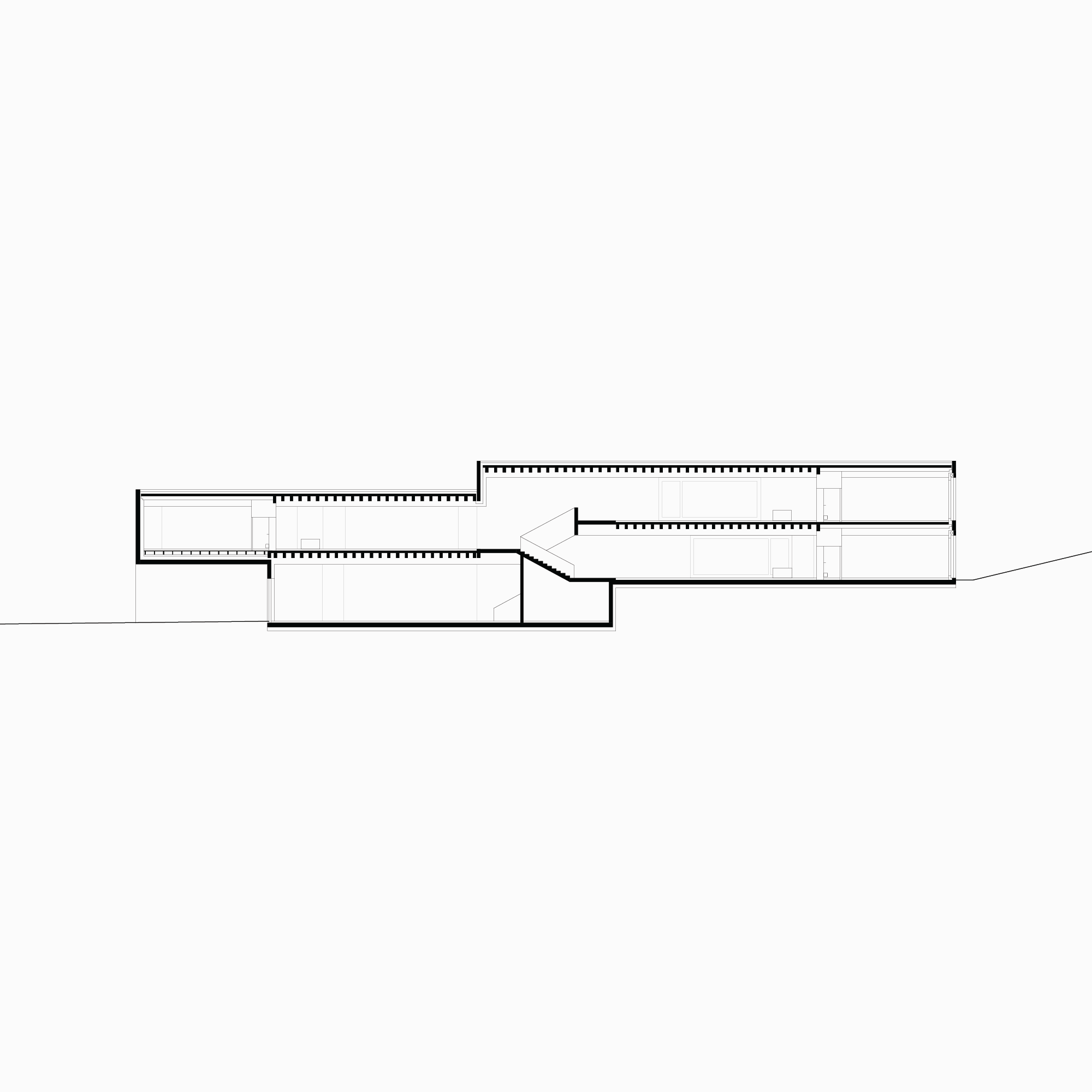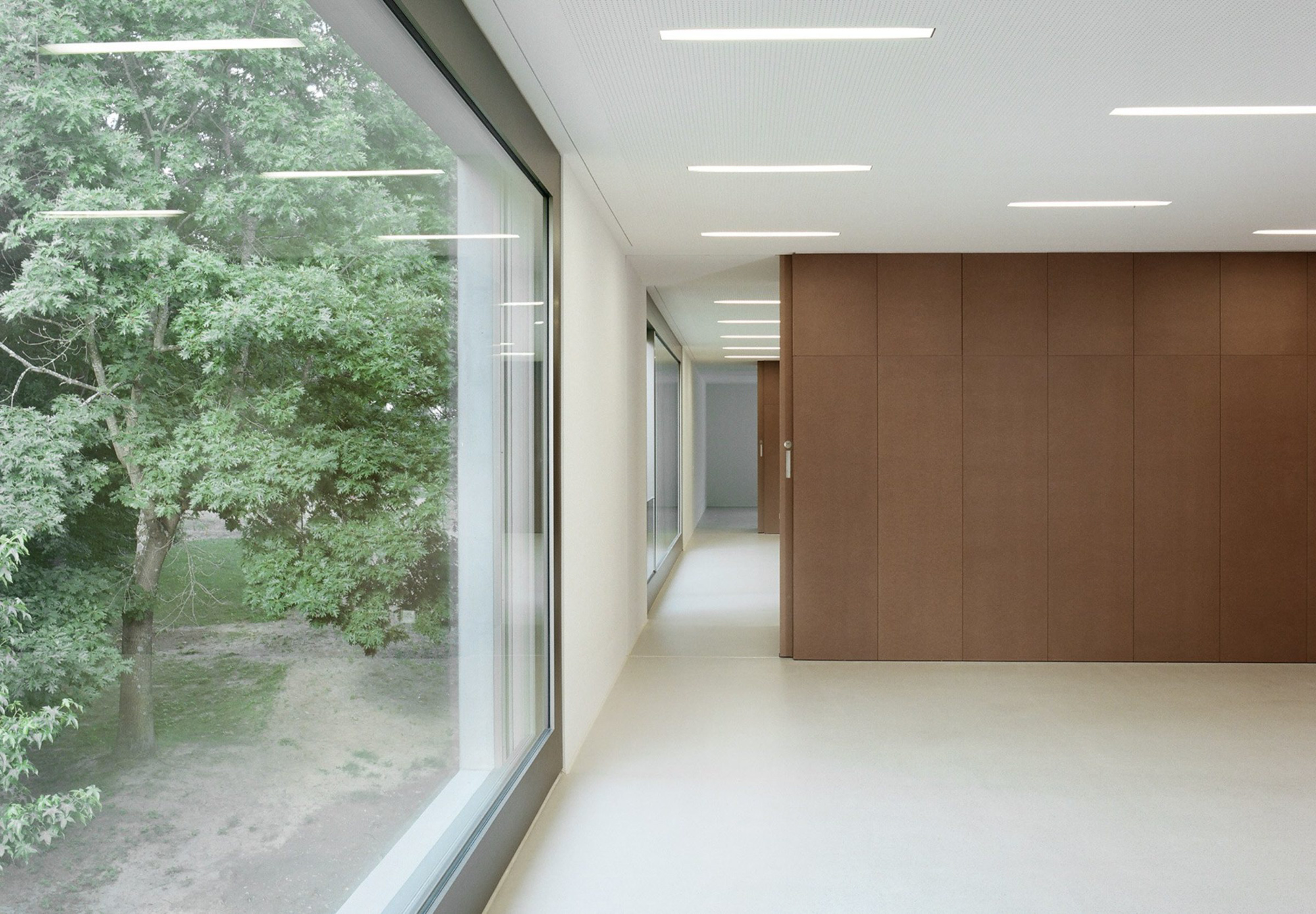 Les deux volumes entremêlés qui composent le bâtiment sont posés sur la pente régulière du terrain. Leur hauteur modeste et leur position décalée verticalement et horizontalement confère à l’objet un caractère sobre, calme et une échelle raisonnable. On retrouve cette sobriété dans la composition des façades où s’alternent des pleins gris clairs et de grandes ouvertures. Le nombre limité des fenêtres, leur proportion large et leur disposition concourent à l’expression calme et rassurante de l’école enfantine.