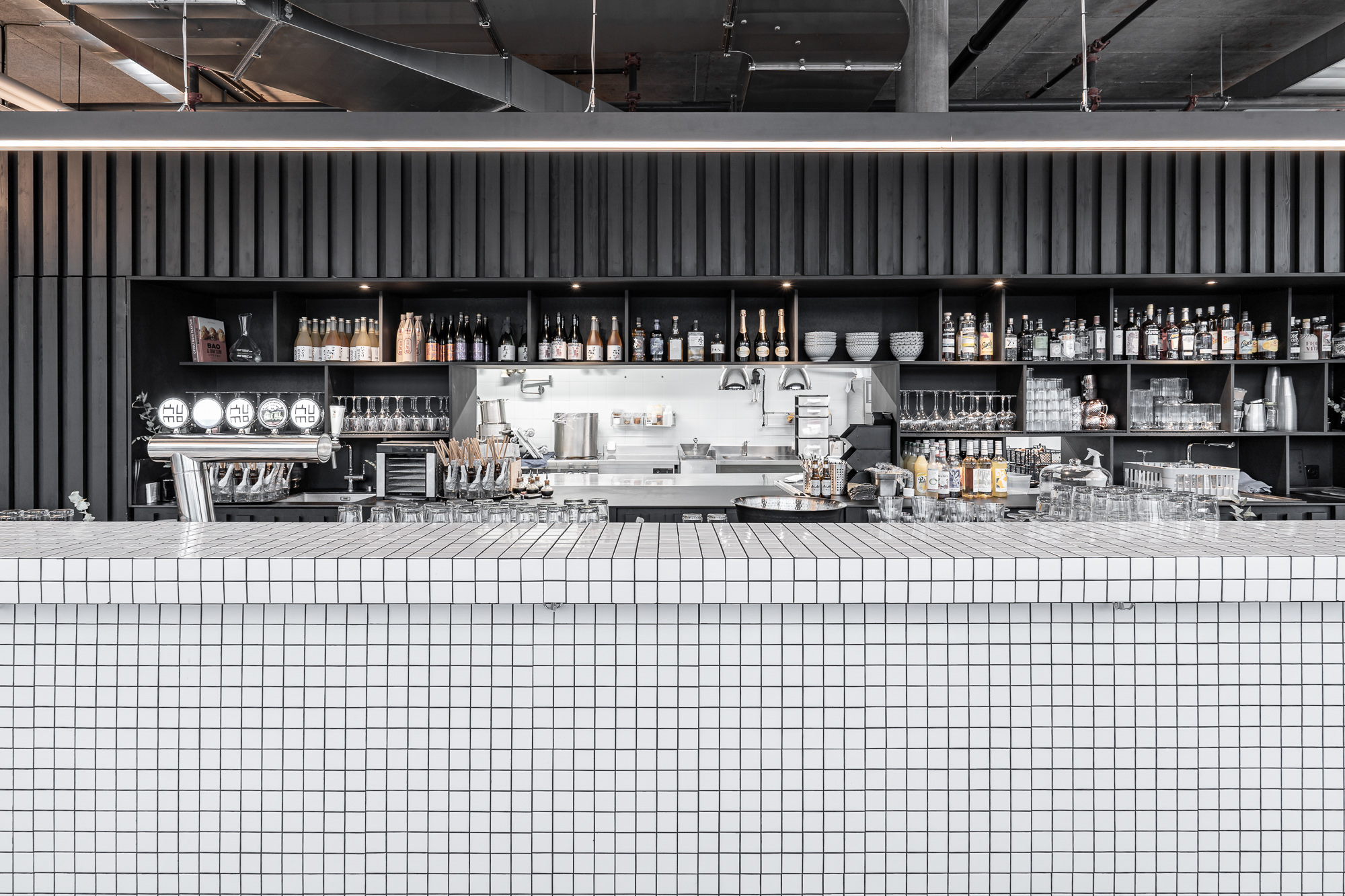La géométrie particulière de l’espace nécessitait une intervention simple. Deux blocs revêtus de lames de bois noir abritent la cuisine et les services. Ce dispositif permet de disposer d’une zone d’accueil côté place, de surfaces qualitatives pour les tables le long des vitrages ou dans le passage qui relie le restaurant au mall du centre commercial. Depuis l’extérieur, c’est le bar qui est mis en scène.