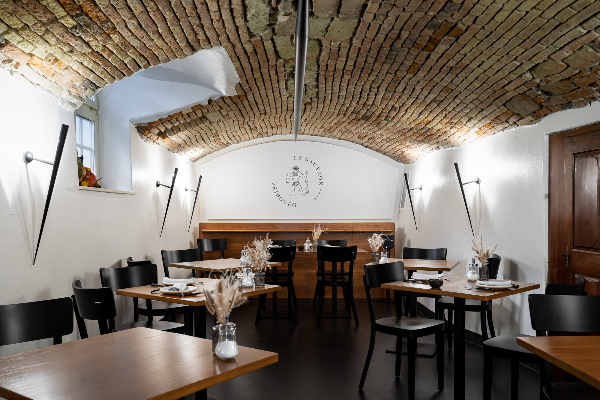 L’hôtel restaurant Le Sauvage à Fribourg se situe au coeur du quartier de la Planche-Supérieure enBasse-Ville de Fribourg. Le nouvel aménagement du restaurant et du hall d’accueil permet une mise en valeur des vieux murs de la bâtisse médiévale et de sa cave voutée.