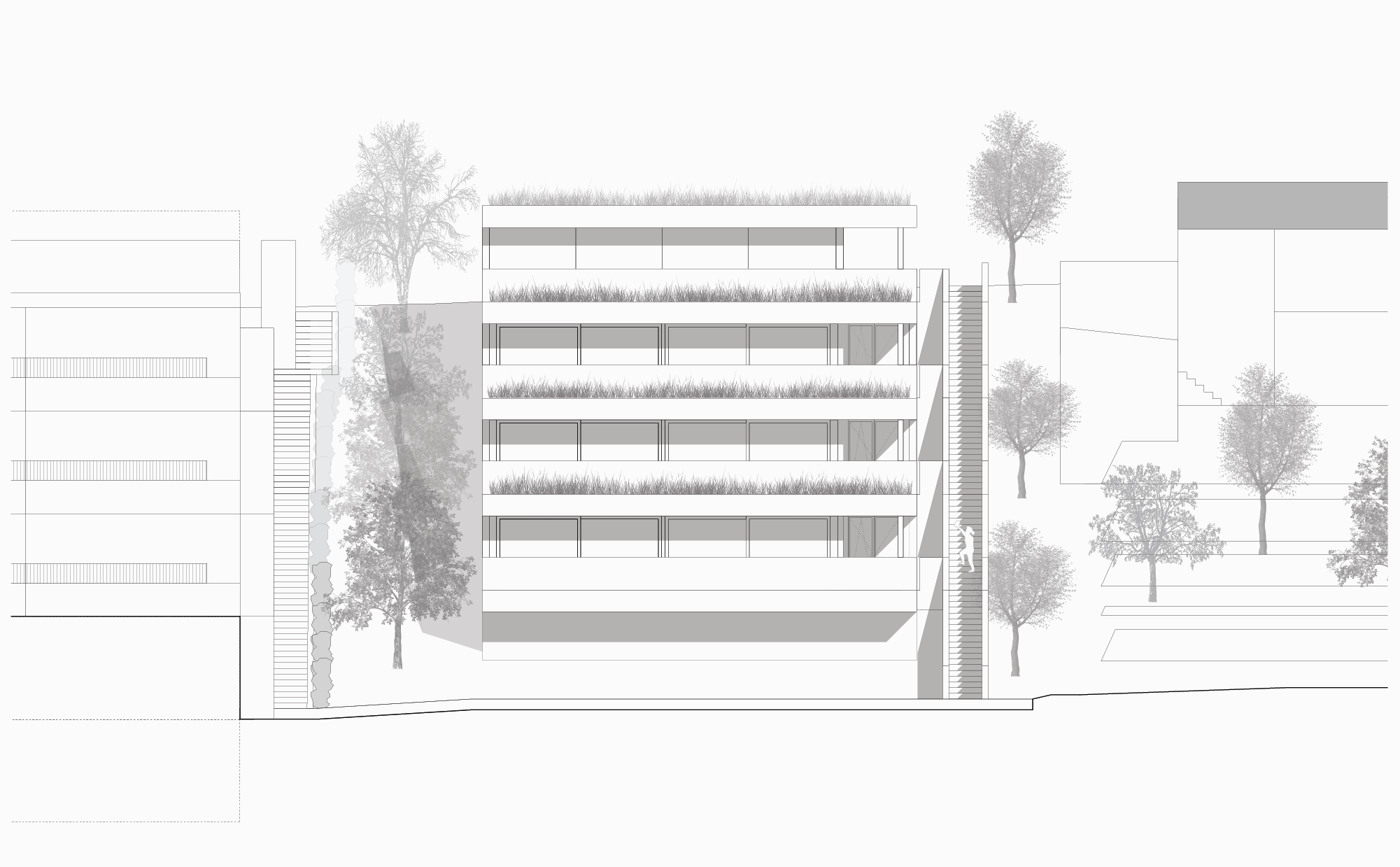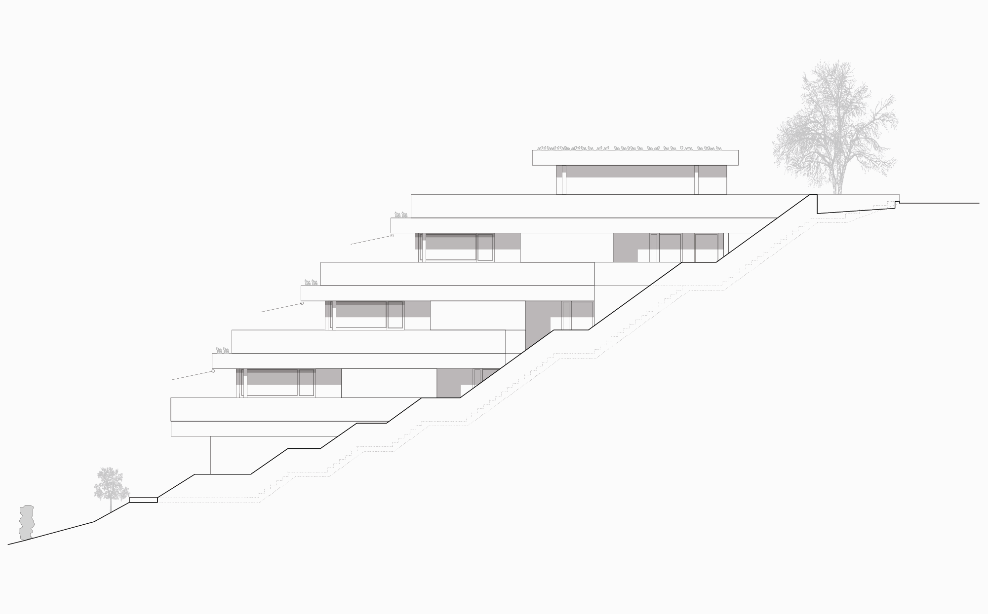Face au lac et aux Alpes, 3 appartements en terrasses se nichent sur un coteau privilégié. L’implantation ainsi que la volumétrie de ce petit immeuble sont dictés par la topographie exigeante de la parcelle.